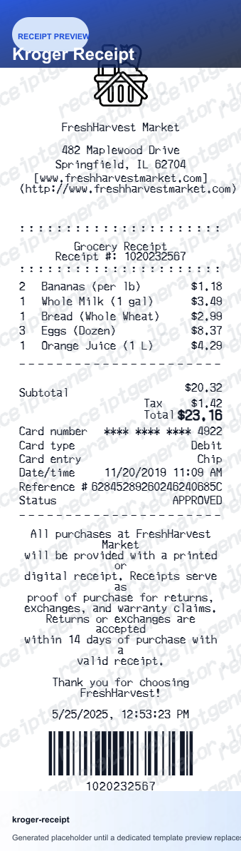 Need a Kroger receipt for expense records or budget tracking? Use this free Kroger receipt generator - add grocery items, Fuel Points, digital savings, and taxes - download a clean PDF in seconds.