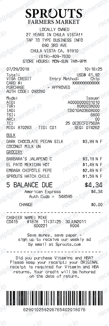 Create a Sprouts Farmers Market-style receipt online with natural grocery items, bulk-bin purchases, sale savings, taxes, and payment details. Export a PDF for grocery records, budget tracking, reimbursement support, or household documentation.